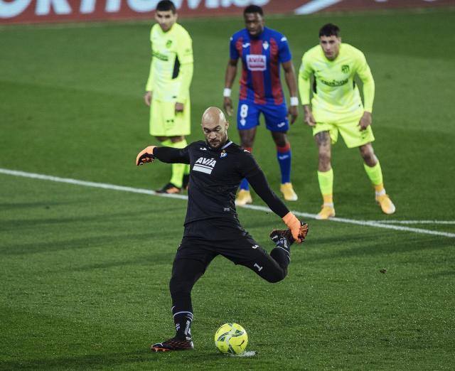 令人意外的是,站在罚球点上的是埃瓦尔门将迪米特洛维奇。这个一身横练块头的光头门将是当今西甲在禁区内最有威慑力的“主动型”,已经被塞维利亚盯上。少有人知道,他居然有一脚点球绝活,他助跑摆腿,稍稍转了一下脚腕,就骗过当今足坛数一数二的门将同行奥布拉克,将球送进另一侧下脚。他庆祝时也挺酷,仿佛那就是自己的本职工作。迪米特洛维奇因此成为西甲历史上第7位有进球记录的守门员。